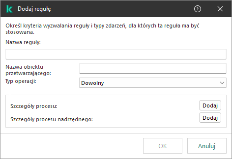 Kaspersky Endpoint Security łączy kryteria wyzwalania reguły z logicznym AND.