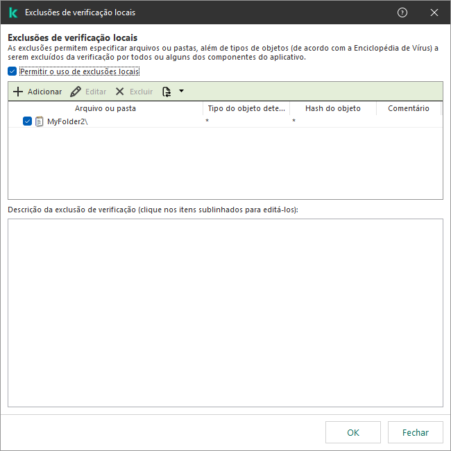 Nova exclusão. O Kaspersky Endpoint Security adiciona uma nova exclusão de verificação à raiz da lista.