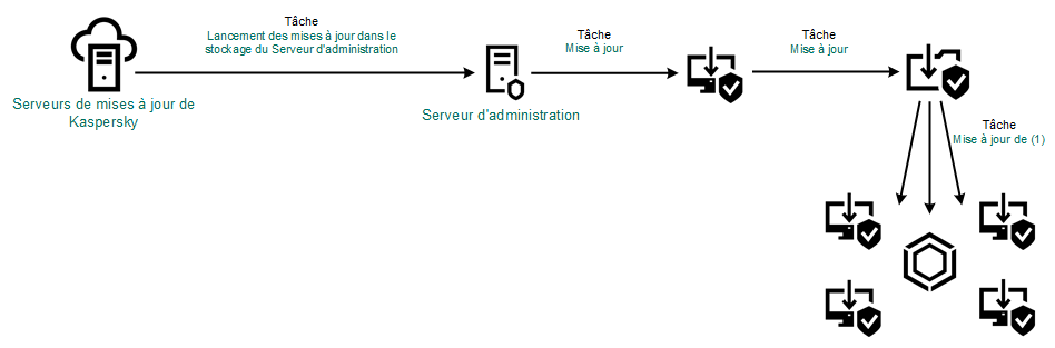 Le téléchargement du paquet de mise à jour dans le stockage est réalisé par la tâche du Serveur d'administration Téléchargement des mises à jour sur le stockage du Serveur d'administration.