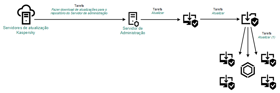 O pacote de atualização é distribuído a computadores clientes pela tarefa Atualização de bancos de dados e módulos do aplicativo do Kaspersky Endpoint Security. Você pode criar um número ilimitado de tarefas de atualização para cada grupo de administração.