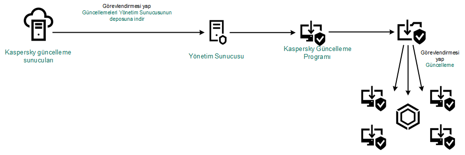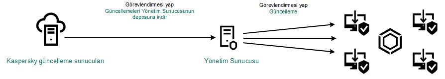 Güncelleme paketi, Kaspersky Endpoint Security Veritabanlarının ve uygulama modüllerinin güncellemesi görevi ile istemci bilgisayarlara dağıtılır. Her bir yönetim grubu için sınırsız sayıda güncelleme görevi oluşturabilirsiniz.