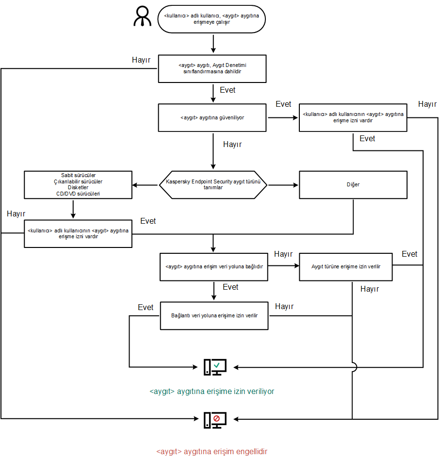 Kaspersky Endpoint Security, kullanıcı aygıtı bilgisayara bağladıktan sonra aygıta erişime izin verip vermeyeceği hakkında bir karar verir (aşağıdaki resme bakın).