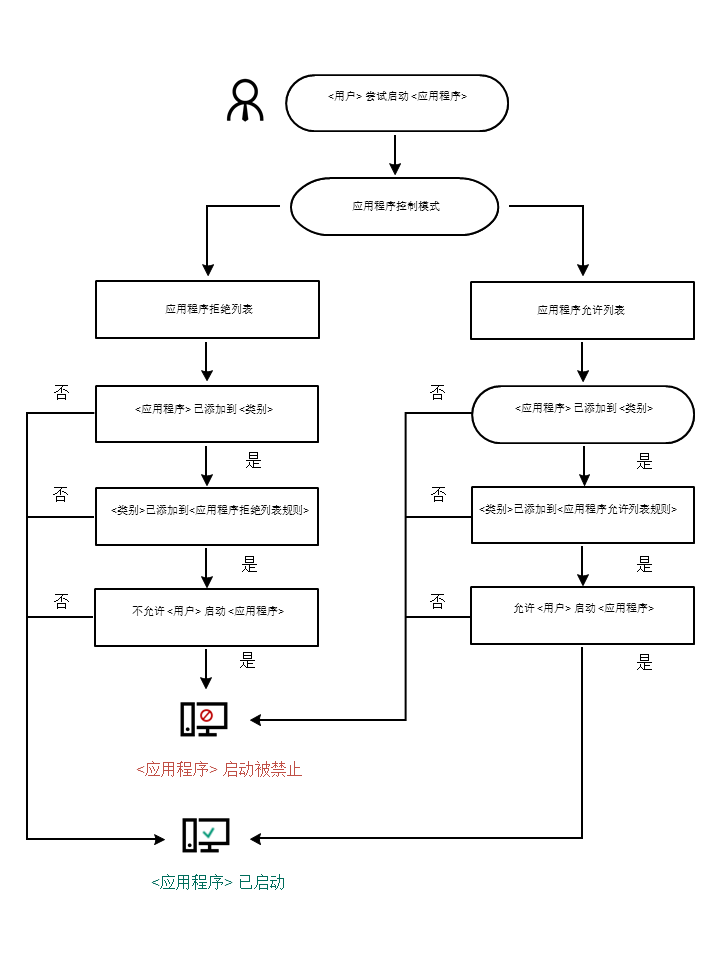 Kaspersky Endpoint Security 使用算法来决定是否启动应用程序(请参见下图)。