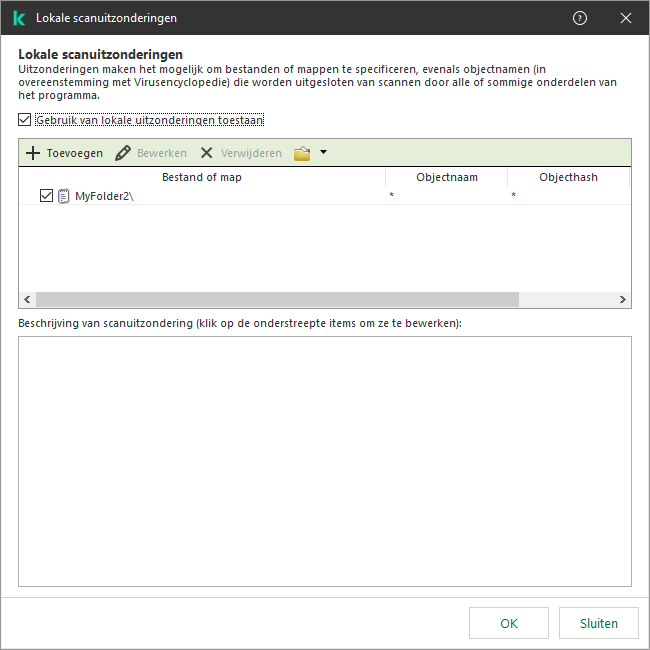 Als u een afzonderlijk bestand van scans wilt uitsluiten, voert u de bestandshash in het veld Objecthash in.