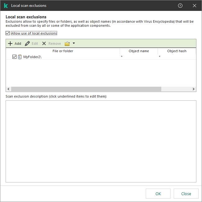 Dacă crearea unei zone de încredere locale este permisă de un administrator, utilizatorul poate adaugă propriile excluderi de la scanare și aplicații de încredere în interfața cu utilizatorul a aplicației. În același timp, utilizatorul nu are permisiuni de modificare sau ștergere a obiectelor din zona de încredere configurată în politică. De asemenea, administratorul poate vizualiza, adăuga, modifica sau șterge elemente din listă în consola Kaspersky Security Center dacă trebuie adăugate excluderi pentru un computer individual.
