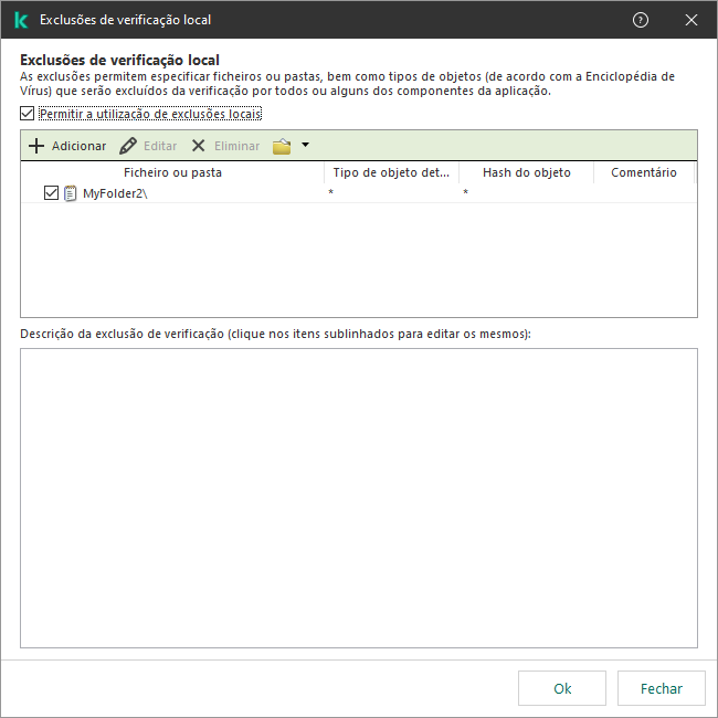 O Kaspersky Endpoint Security oculta a lista de exclusões de verificação na interface de utilizador da aplicação se a configuração de exclusões de verificação for bloqueada pelo administrador na consola (símbolo de "cadeado fechado") e se as exclusões de verificação locais forem proibidas (a caixa de verificação Permitir a utilização de exclusões locais está desmarcada).