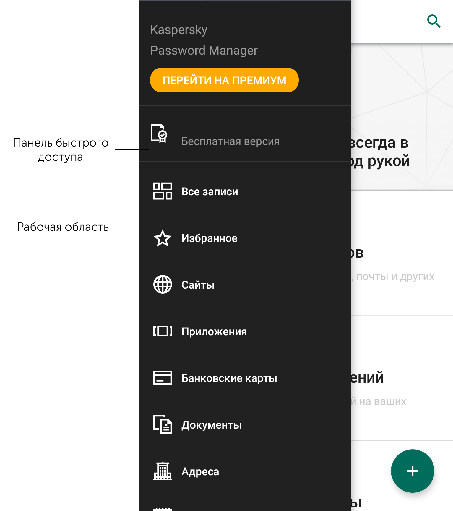 Главное окно приложения состоит из панели быстрого доступа и рабочей области (см. изображение ниже). Панель быстрого доступа позволяет быстро перейти к нужной возможности или настройке Kaspersky Password Manager. Чтобы открыть панель быстрого доступа, нажмите на кнопку