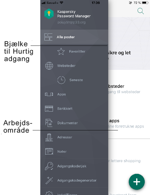 Hovedprogrammets vindue består af genvejslinjen og arbejdsområdet (se billedet nedenfor). Genvejslinjen giver hurtig adgang til Kaspersky Password Manager-funktioner og indstillinger. Hvis din iPhone eller iPad holdes i stående position, er genvejslinjen som standard skjult. For at åbne genvejslinjen skal du trykke på