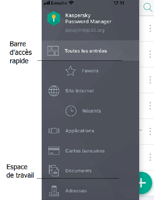 La fenêtre principale de l'app comprend la barre d'accès rapide et la zone de travail (voir image ci-dessous). La barre d'accès rapide offre un accès rapide aux fonctions et aux paramètres de Kaspersky Password Manager. Sur votre iPhone ou iPad dans l'orientation portrait, la barre d'accès rapide est masquée par défaut. Pour ouvrir la barre d'accès rapide, appuyez sur