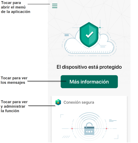 La ventana principal de Kaspersky Security Cloud en su dispositivo móvil se muestra en la imagen que aparece a continuación.