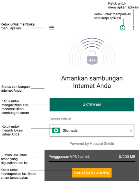 Menu aplikasi memberikan akses cepat ke fitur dan pengaturan Kaspersky Secure Connection.