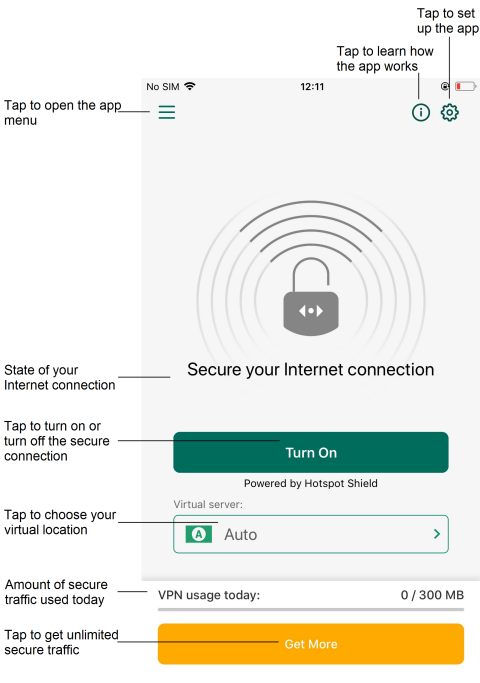 The main window of Kaspersky Secure Connection on your mobile device is shown in the picture below.