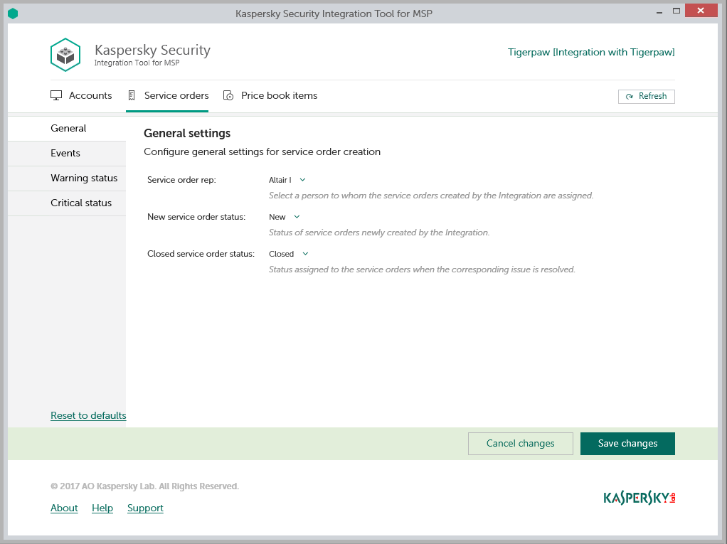 In the General section of the Service orders tab, you can configure general settings for service order creation. General settings are applicable to all service orders that have been automatically created in Tigerpaw as a result of events or computer status changes that occur in Kaspersky Lab products. General settings provide the required initial values to the service order attributes so that service orders are created correctly in Tigerpaw.