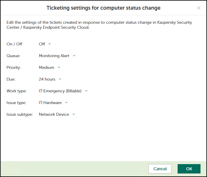On the Ticketing tab, you can configure ticketing rules for the computer statuses. This allows tickets to be created in Autotask when the computer status in Kaspersky Security Center or Kaspersky Endpoint Security Cloud changes to Warning or Critical. You can edit ticketing settings either for an individual computer status or for several statuses at the same time.