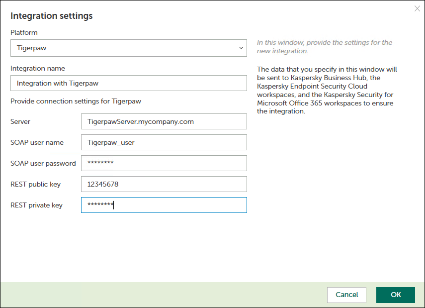 Integration name—Name of the new integration. This field cannot be blank. By default, the integration name is Integration with Tigerpaw. The integration name is displayed in the Kaspersky Security Integration Tool for MSP window as a link that allows you to view and access the integration properties.