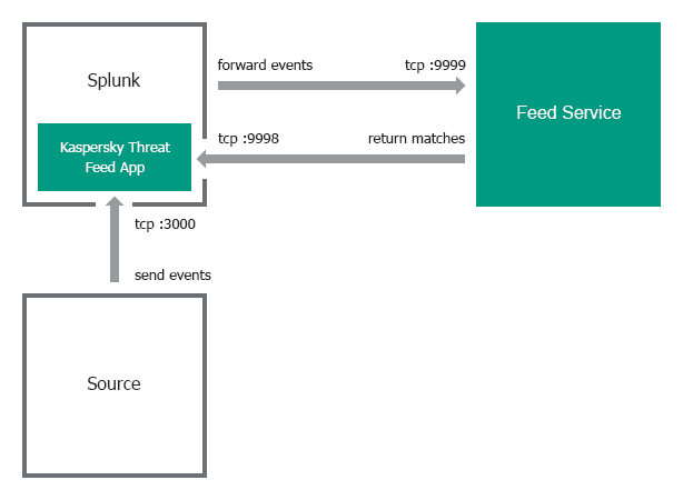 In the single-instance integration scheme, Splunk Apps and Feed Service work on the same computer by default (IP address is 127.0.0.1). Kaspersky CyberTrace App receives input on port 3000 and forwards it to Feed Service on port 9999. Feed Service then returns matches to Kaspersky CyberTrace App on port 9998.