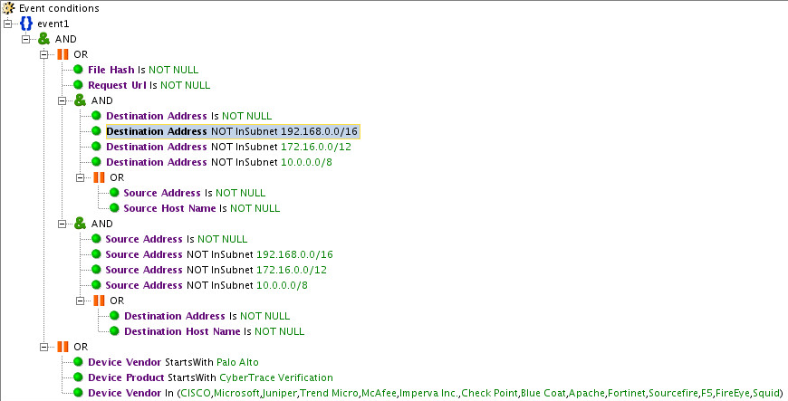 Source Address or Source Host Name field of an event is not empty and the value of the Destination Address field is not subnets 192.168.0.0/16, 172.16.0.0/12, or 10.0.0.0/8.Destination Address or Destination Host Name field of an event is not empty and the value of the Source Address field is not subnets 192.168.0.0/16, 172.16.0.0/12, or 10.0.0.0/8.Request URL field of an event contains a URL.fileHash field of an event contains a hash.The use of the original CyberTrace forwarding events filter can significantly diminish the performance of ArcSight ESM. To reduce the load on the ArcSight ESM computer, edit the filter so that it will send fewer events or will make fewer checks. For example, you can remove from the filter those vendors whose events do not arrive in ArcSight or that need not be checked by Feed Service.