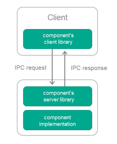 Most components included in the KasperskyOS SDK may be used in a solution both locally (through static linking with other components) as well as via IPC.