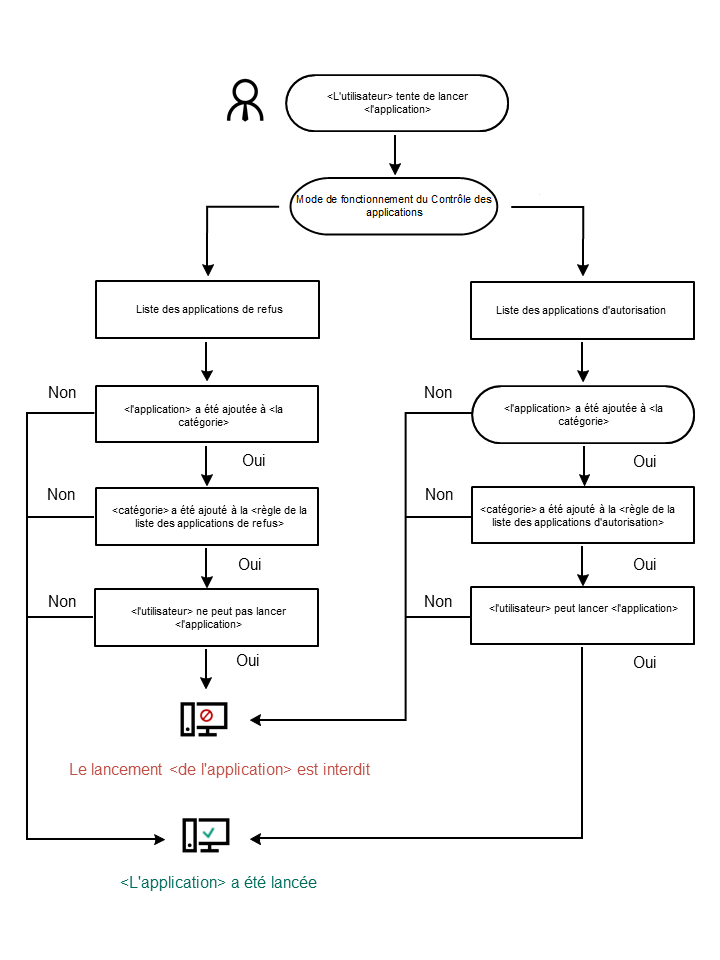 Si les règles d'autorisation de Contrôle des applications sont les plus strictes, le module interdit le lancement de toutes les nouvelles applications qui n'ont pas été vérifiées par l'administrateur du réseau local, mais il garantit le fonctionnement du système d'exploitation et des applications vérifiées nécessaires aux utilisateurs dans l'exécution de leurs tâches.