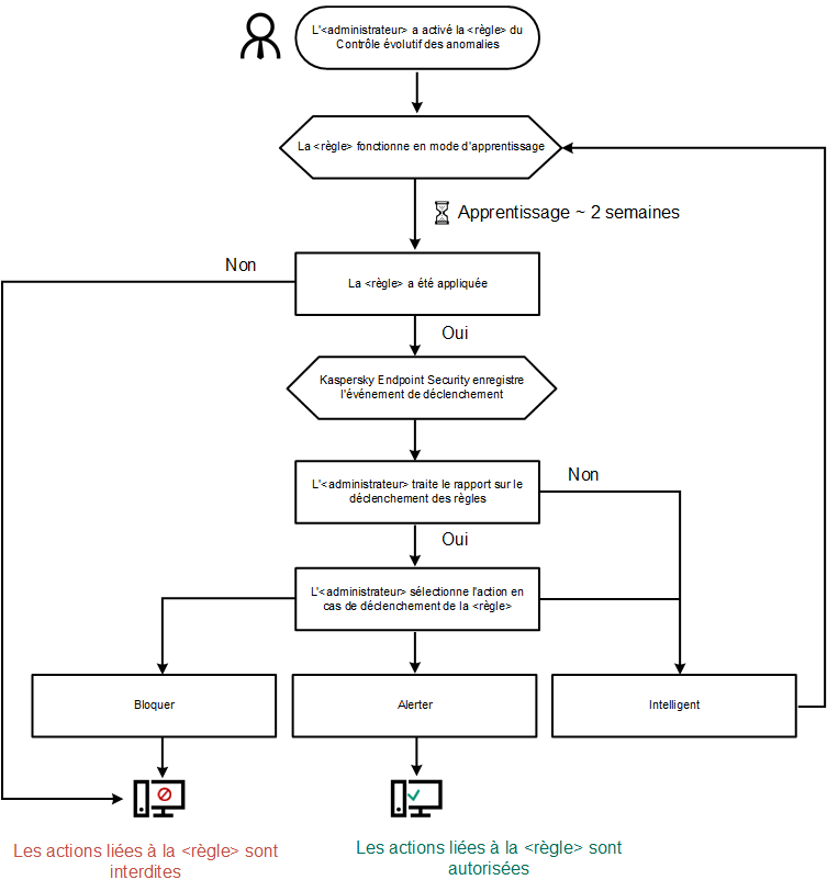 Une fois que le Contrôle évolutif des anomalies a été activé, les règles fonctionnent en mode d'apprentissage. Au cours de l'apprentissage, le Contrôle évolutif des anomalies surveille le déclenchement des règles et envoie les événements déclencheurs à Kaspersky Security Center. La durée du mode d'apprentissage est propre à chaque règle. Celle-ci est définie par les experts de Kaspersky. En règle générale, le mode d'apprentissage dure 2 semaines.