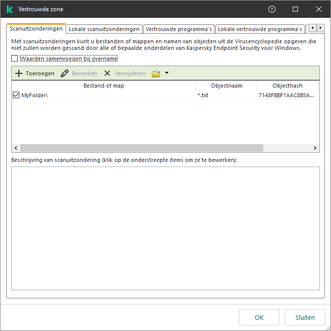 Als het maken van een lokale vertrouwde zone is toegestaan door een beheerder, kan de gebruiker zijn eigen scanuitzonderingen en vertrouwde programma’s toevoegen in de gebruikersinterface van het programma. Tegelijkertijd heeft de gebruiker geen machtigingen om objecten te wijzigen of te verwijderen uit de vertrouwde zone die in het beleid is geconfigureerd. De beheerder kan ook lijstitems bekijken, toevoegen, wijzigen of verwijderen in de Kaspersky Security Center-console als er uitzonderingen moeten worden toegevoegd voor een individuele computer.