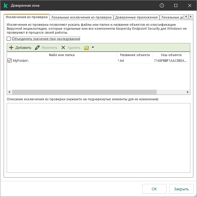 У пользователя есть возможность формировать собственную локальную доверенную зону для отдельного компьютера. Таким образом, кроме общей доверенной зоны, сформированной в политике, пользователь может создавать собственные локальные списки исключений из проверки и доверенных приложений. Администратор может разрешить или запретить использование локальных исключений или локальных доверенных приложений в параметрах политики. Для этого предназначены флажки Разрешить использование локальных исключений и Разрешить использование локальных доверенных приложений в разделе политики Исключения.