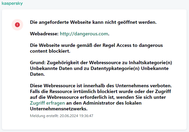 Abhängig davon, welche Aktion in den Eigenschaften der Regeln für die Web-Kontrolle festgelegt ist, zeigt Kaspersky Endpoint Security beim Versuch eines Benutzers, Zugriff auf Webressourcen zu erhalten, eine Meldung an (die Antwort des HTTP-Servers wird durch eine HTML-Seite mit einer Meldung ersetzt). Folgende Meldungstypen sind möglich: