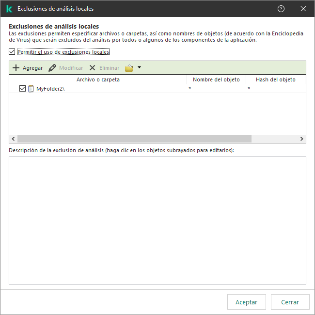 Esto abre una ventana que contiene una lista de exclusiones locales.