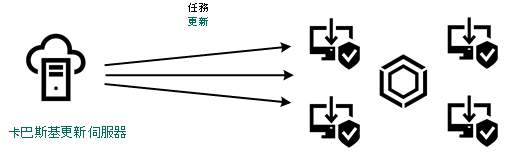 更新透過標準網路通訊協定從卡巴斯基更新伺服器或其他 FTP 或 HTTP 伺服器下載。如果存取更新來源需要連線代理伺服器,則在 Kaspersky Endpoint Security 政策設定中指定代理伺服器設定。