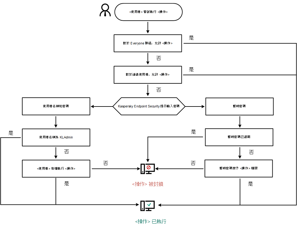 Kaspersky Endpoint Security 根據以下演算法決定是允許還是封鎖受密碼防護的操作(請參見下圖)。