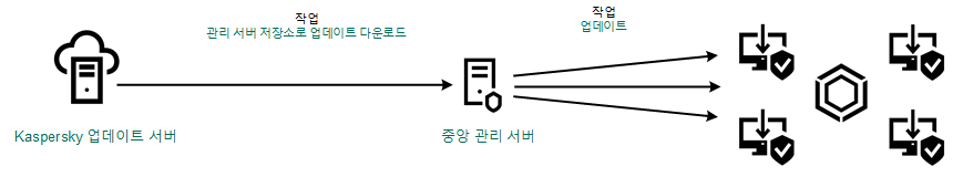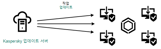 업데이트 패키지는 Kaspersky Endpoint Security 데이터베이스 및 애플리케이션 모듈 업데이트 작업을 통해 클라이언트 컴퓨터로 배포됩니다. 각 관리 그룹에 대해 업데이트 작업을 수에 제한 없이 생성할 수 있습니다.