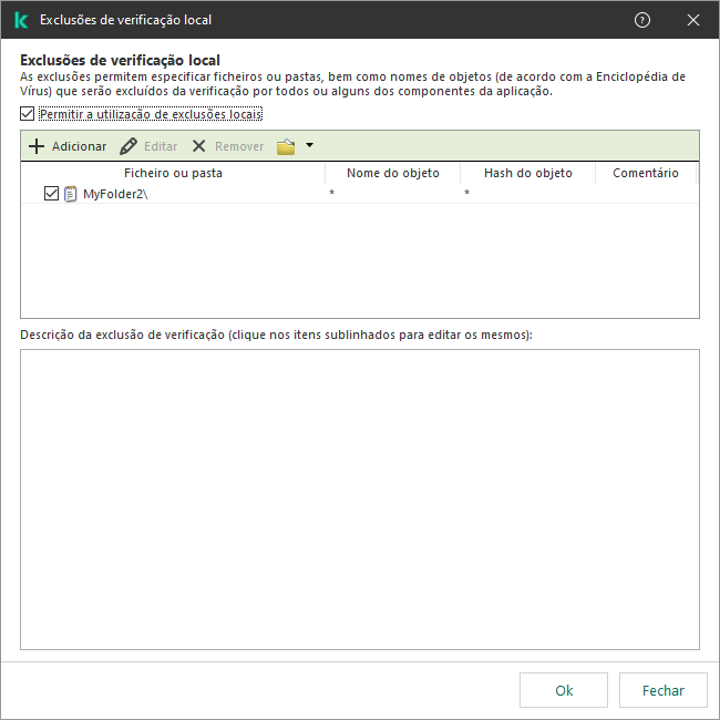 O Kaspersky Endpoint Security oculta a lista de exclusões de verificação na interface de utilizador da aplicação se a configuração de exclusões de verificação for bloqueada pelo administrador na consola (símbolo de "cadeado fechado") e se as exclusões de verificação locais forem proibidas (a caixa de verificação Permitir a utilização de exclusões locais está desmarcada).