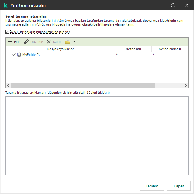 Eğer taramalardan nesnenin belirli türünü dışlamak istiyorsanız, Nesne adı alanında Kaspersky Ansiklopedisinin sınıflandırmasına göre nesnenin adını girin (örneğin Email-Worm, Rootkit veya RemoteAdmin).