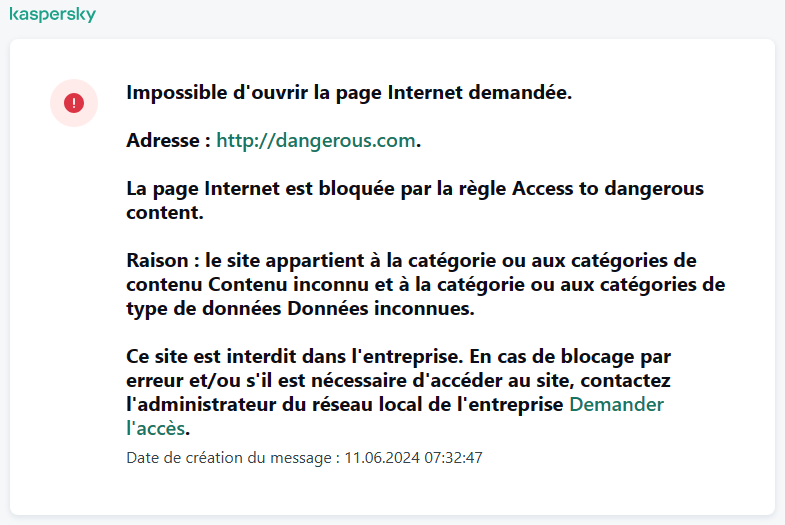 Si l'utilisateur considère que l'accès à la ressource Internet a été bloqué par erreur, il peut cliquer sur le lien dans le corps du message de blocage du site Internet pour envoyer un message prérédigé destiné à l'administrateur du réseau local d'entreprise.