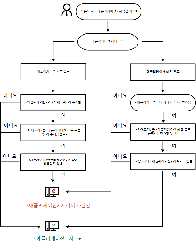 Kaspersky Endpoint Security는 알고리즘을 사용하여 애플리케이션 시작에 대한 결정을 내립니다(아래 그림 참조).