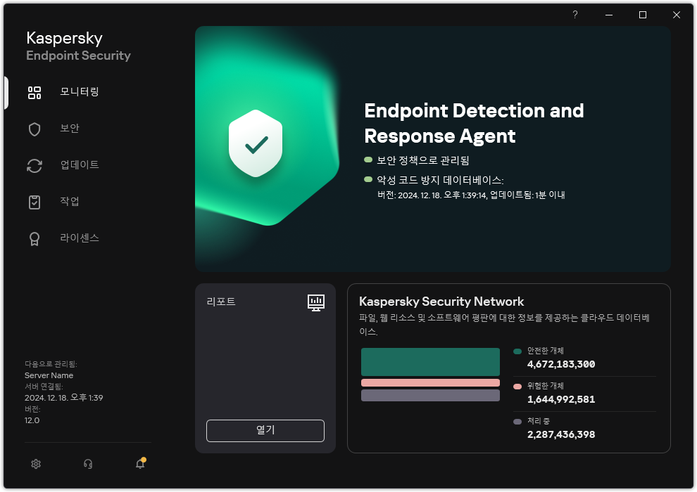 결과적으로 EDR Agent가 사용자 컴퓨터에 설치됩니다. 애플리케이션의 인터페이스를 사용할 수 있으며 알림 영역에