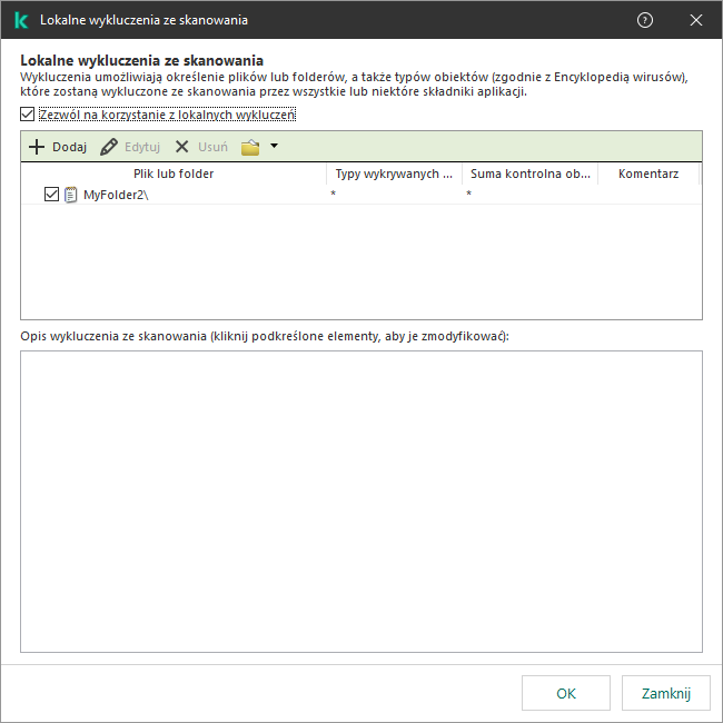Jeśli to konieczne, w polu Komentarz wprowadź krótki komentarz dotyczący tworzonego wykluczenia ze skanowania.