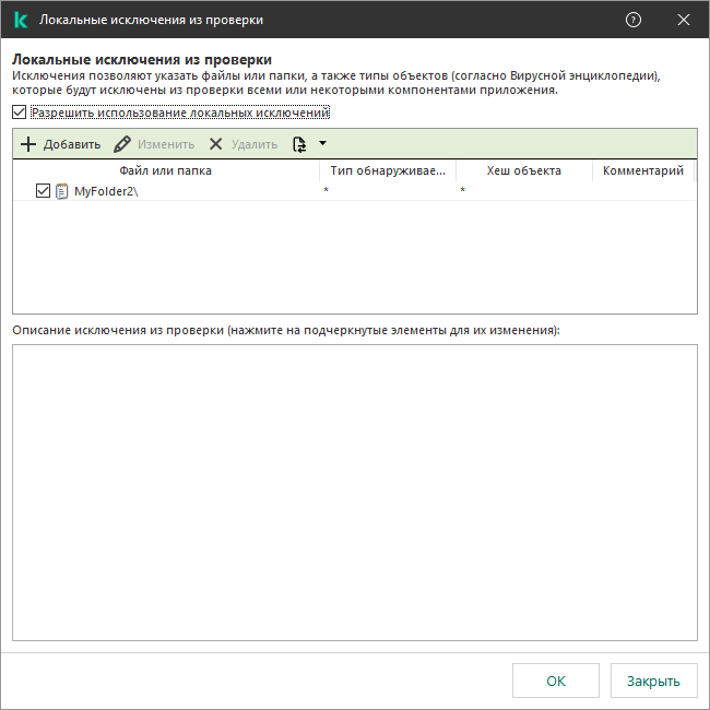 Если необходимо, в поле Комментарий введите краткий комментарий к создаваемому исключению из проверки.
