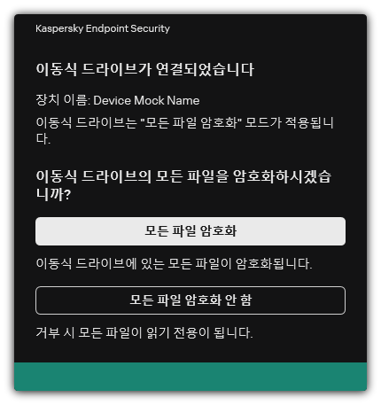정책이 적용된 후 사용자가 이동식 드라이브를 연결하거나 이동식 드라이브가 이미 연결되어 있을 경우 Kaspersky Endpoint Security가 암호화 작업을 수행할 것인지를 확인하는 메시지를 표시합니다(아래 그림 참조).