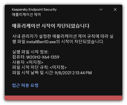 사용자가 애플리케이션 제어 규칙에 의해 차단된 애플리케이션을 시작하려고 시도하는 경우 Kaspersky Endpoint Security는 해당 애플리케이션의 시작이 차단되었다는 메시지 상태를 표시합니다. 사용자가 애플리케이션 시작이 잘못 차단되었다고 생각한다면, 사용자는 메시지 텍스트의 링크를 사용하여 메시지를 회사 네트워크 관리자에게 전송할 수 있습니다.