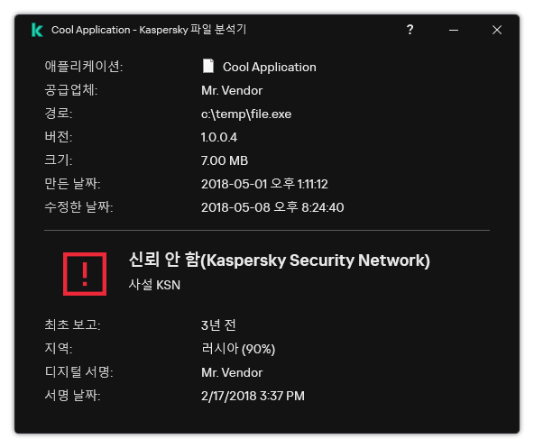 파일의 보안이 의심스러운 경우 Kaspersky Security Network에서 파일의 평판을 확인할 수 있습니다.