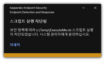 결과적으로 Kaspersky Endpoint Security가 개체의 실행을 차단합니다: 실행 파일 및 스크립트 실행, 오피스 형식 파일 열기. 스크립트 실행이 차단되어도 텍스트 에디터 등으로 스크립트 파일을 열 수는 있습니다. 알림이 애플리케이션 설정에서 활성화되어 있다면 개체 실행 차단 시 Kaspersky Endpoint Security가 기본 알림을 표시합니다(아래 그림 참조).
