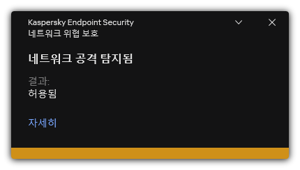 결과적으로 Kaspersky Endpoint Security는 사용자 컴퓨터에 대한 네트워크 공격 시도를 탐지하면 공격 컴퓨터와의 모든 연결을 차단합니다. Kaspersky Endpoint Security에서 네트워크 공격 탐지 이벤트를 띄웁니다. 이벤트에는 공격을 시도한 컴퓨터의 정보(IP 및 MAC 주소)가 포함됩니다.