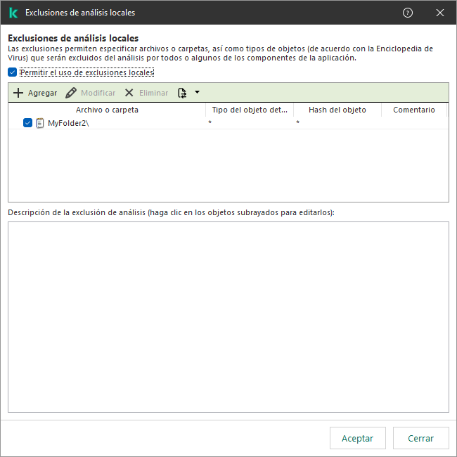 Si un administrador permite la creación de una zona de confianza local, el usuario puede agregar sus propias exclusiones de análisis y aplicaciones de confianza en la interfaz de usuario de la aplicación. Al mismo tiempo, el usuario no tiene permisos para modificar o eliminar objetos de la zona de confianza configurada en la directiva. El administrador también puede ver, agregar, modificar o eliminar elementos de la lista en la consola de Kaspersky Security Center si es necesario agregar exclusiones para un equipo individual.