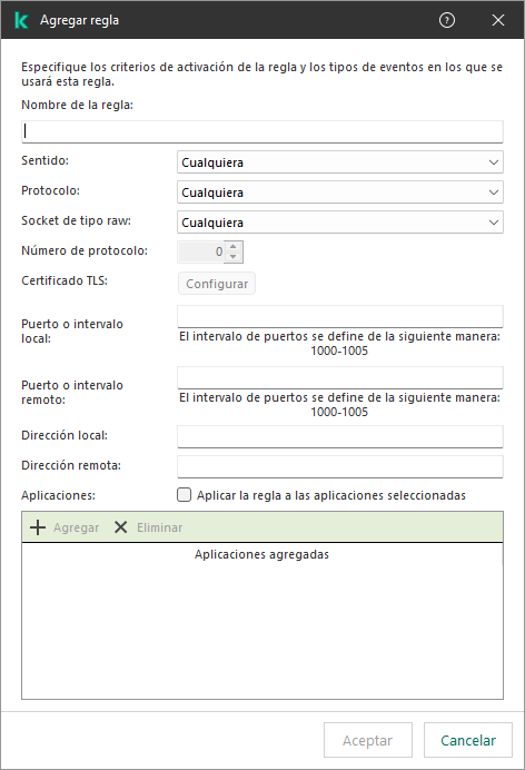 Kaspersky Endpoint Security combina los criterios de activación de la regla con un operador lógico AND.