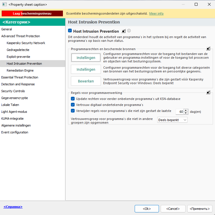 Kaspersky Endpoint Security controleert de bestands- en netwerkactiviteit van het programma in het besturingssysteem niet. U kunt het monitoren van programma-activiteit configureren voor verschillende onderdelen van Kaspersky Endpoint Security: