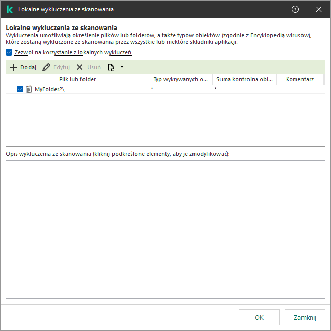 Jeśli to konieczne, w polu Komentarz wprowadź krótki komentarz dotyczący tworzonego wykluczenia ze skanowania.