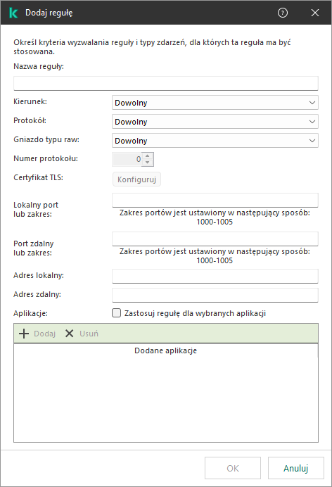Kaspersky Endpoint Security łączy kryteria wyzwalania reguły z logicznym AND.