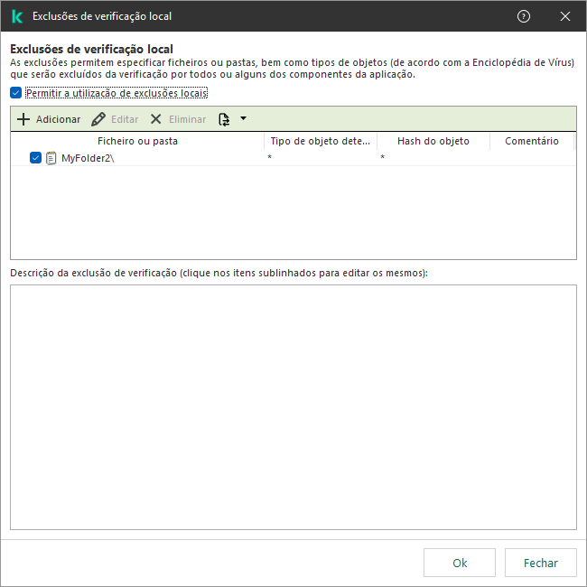 O Kaspersky Endpoint Security oculta a lista de exclusões de verificação na interface de utilizador da aplicação se a configuração de exclusões de verificação for bloqueada pelo administrador na consola (símbolo de "cadeado fechado") e se as exclusões de verificação locais forem proibidas (a caixa de verificação Permitir a utilização de exclusões locais está desmarcada).