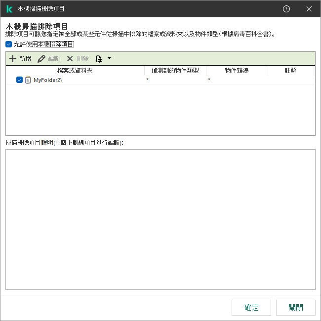 建立本機排除項目的規則與建立一般排除項目的規則相同。Kaspersky Endpoint Security 輸入遮罩時支援環境變量以及*和?字元。